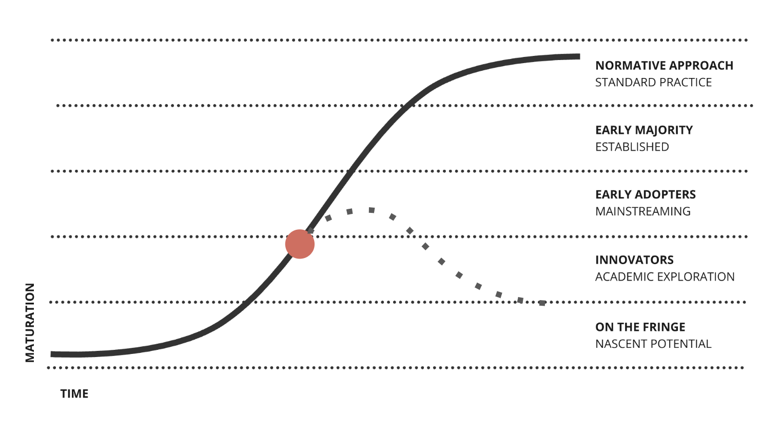 The humanitarian sector’s adoption of novel data sources can be mapped against an S-Curve (adapted from Fisher, 1971), which measures maturity from nascent potential to normative practice. For example, the use of satellite data to create dynamic, high-resolution population estimates has moved from a ‘nascent’ opportunity towards a common practice, proving particularly valuable in contexts with limited or outdated census data. The S-Curve creates a way to plot examples of where novel data sources have been integrated into crisis response analysis or appear trapped in a perpetual pilot phase.