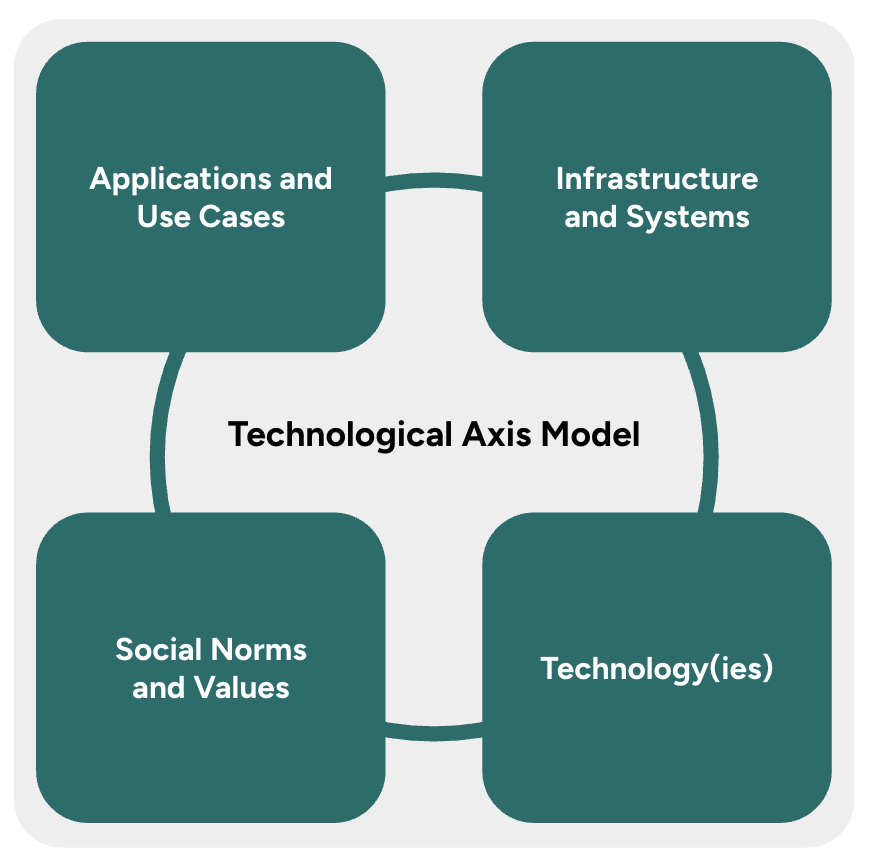 The Technology Axis Model was originally developed by Bill Sharpe as a way to help engineers think more widely about the contexts that surround technology innovation. Our definitions are drawn from a forthcoming paper on the Technology Axis Model, by Bill Sharpe and Andrew Curry.